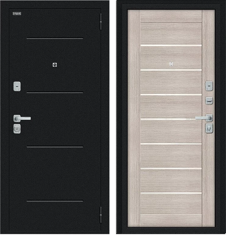 Надежная входная Дверь Браво Техно/BChrome Букле черное/Cappuccino Melinga премиум класса по цене 34 471 руб. Большая толщина стали защитит от проникновения в ваш дом, квартиру или коттедж. Используется очень качественная фурнитура: замки, цилиндры, ручки, защелки. Покрытие и отделка двери изготовлено под внимательным контролем производителя. Дверь имеет долгий срок службы и гарантию.